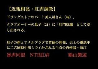 アナル 【近親相姦・肛虐調教】 ドラッグストアのパート美人母さん(48)、 クラブオーナーの息子(21)に「肛門奴●」として差し出される。 息子の指とアナルプラグで背徳の開発、夫との電話中に二穴同時中出しでイかされる白衣の肉便器・菊江【熟女のアナル漫画】d_703528